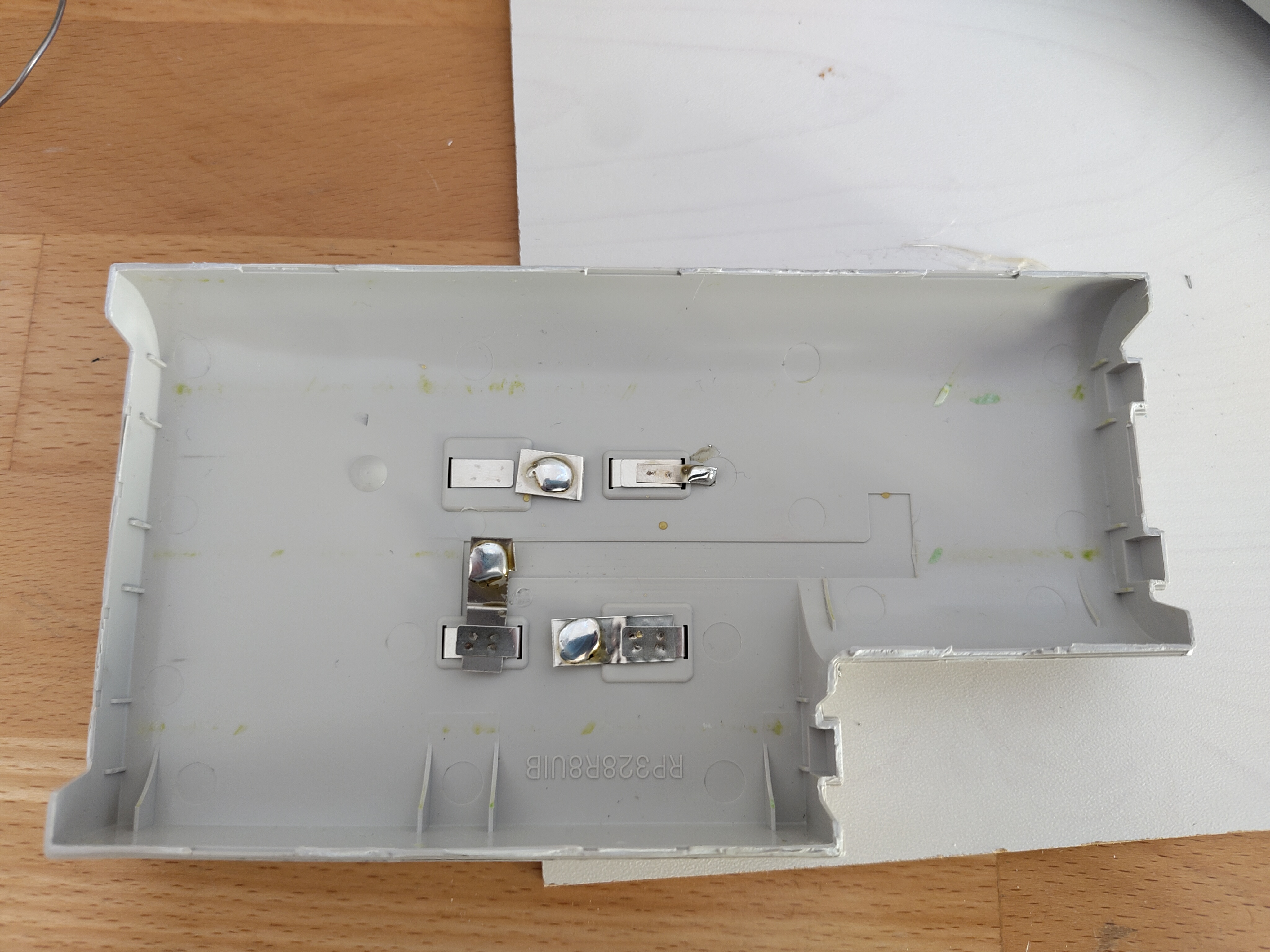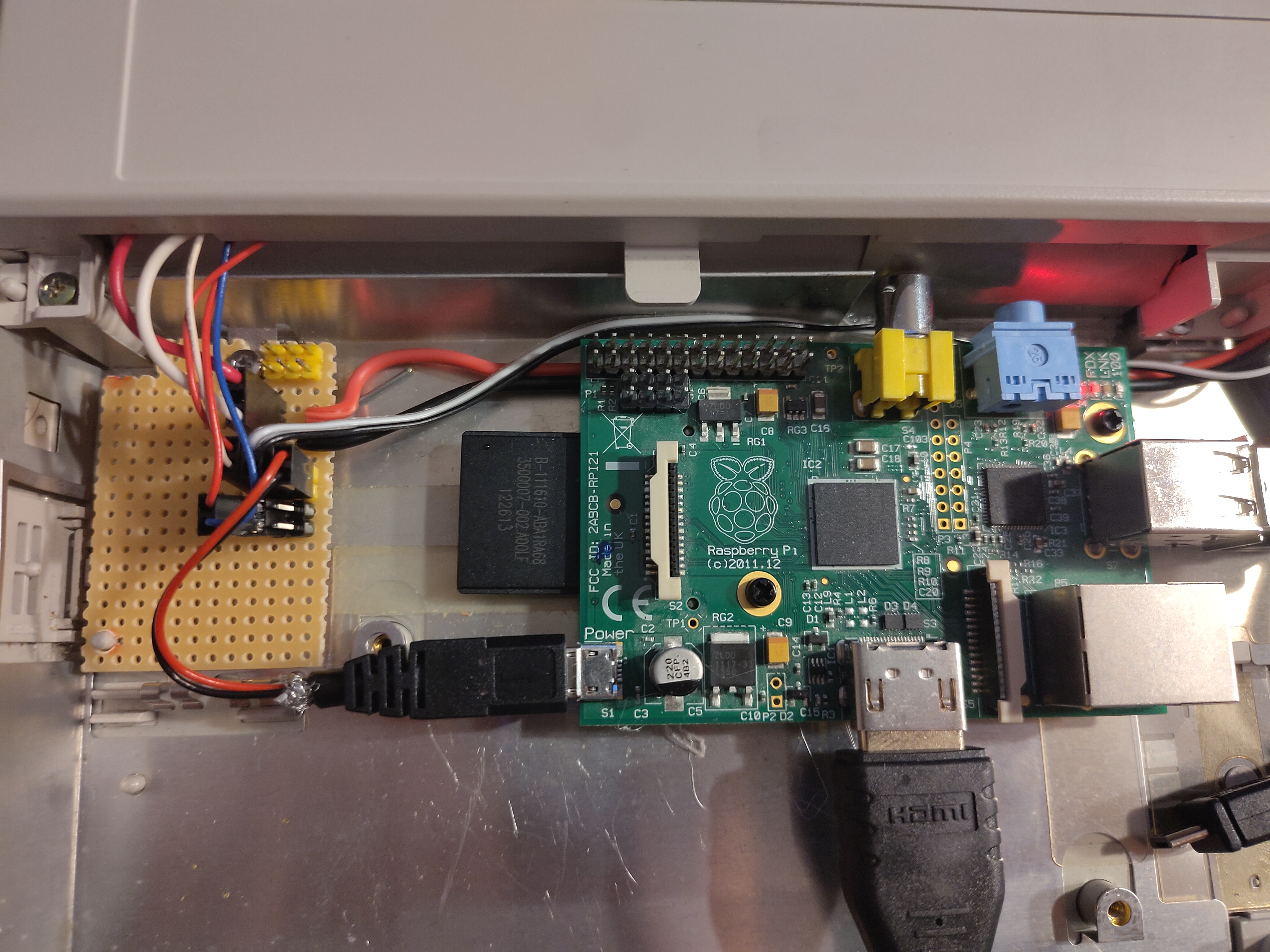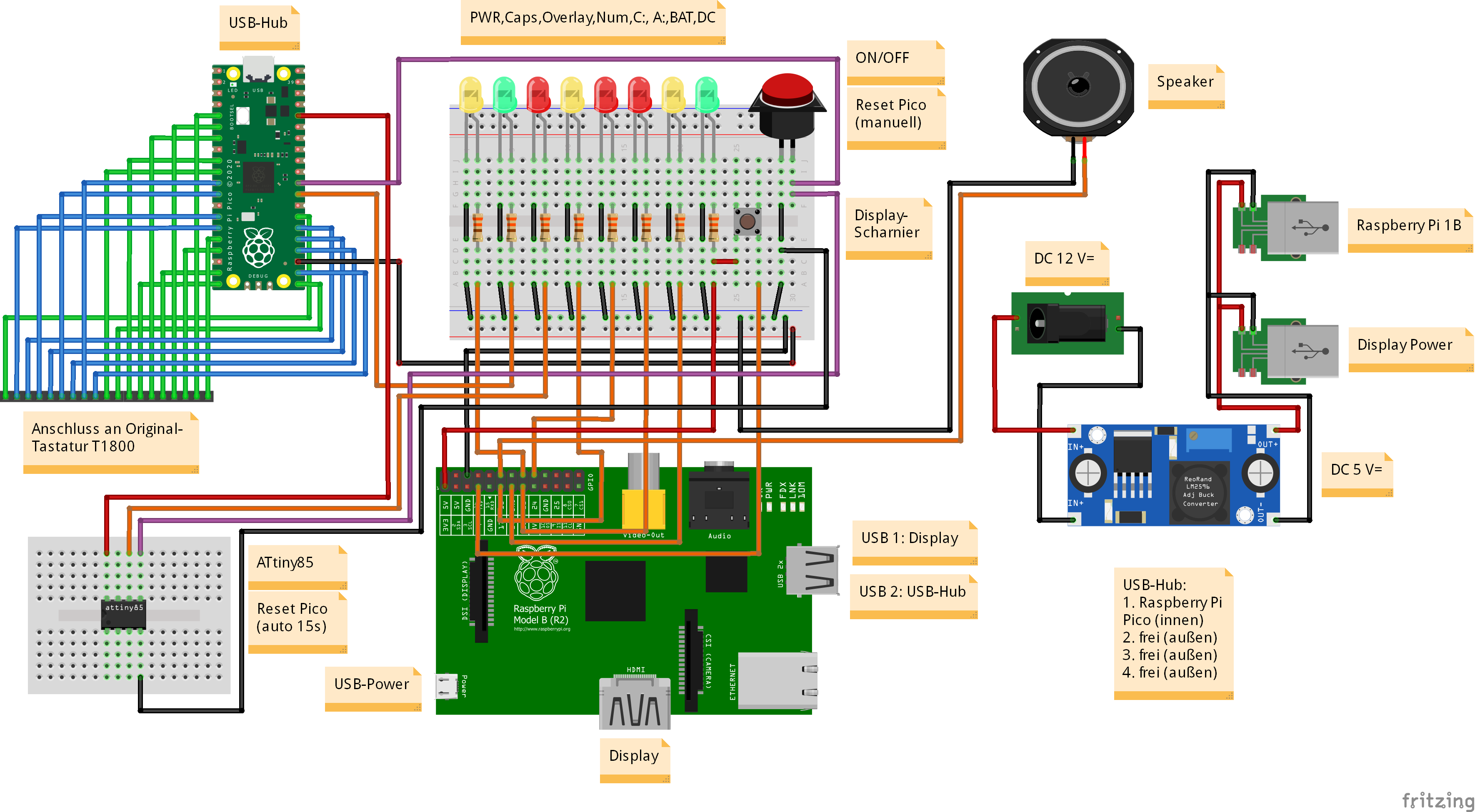 Die Stromversorgung, d.h. der DC-DC-Wandler, wurde in den alten Akku-Gehäuse untergebracht. Dies war umso leichter möglich, als von den Akku-Kontakten an der Unterseite des Laptop-Gehäuses zwei Adernpaare in das Laptop-Unterteil führten, die auf diese Weise - mit Dupont-Buchsen versehen - weitergenutzt werden konnten: Das dickere Andernpaar führt die 12 Volt Eingangsspannung von der Power-Buchse zum Spannungswandler; von dort transportiert das dünnere Adernpaar die 5 Volt Ausgangsspannung über eine Lochrasterplatine mittels umgebauter Micro-USB-Anschlusskabel sowohl zum Display als auch zum Raspberry Pi 1B, um beide Geräte mit Strom zu versorgen: