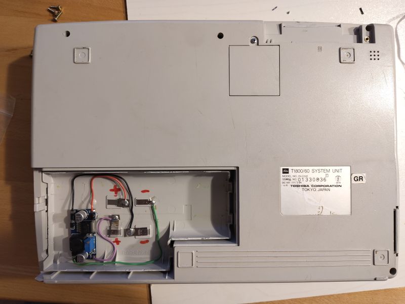 Die Power-Buchse aus dem T1800 konnte aufgrund eines proprietären Formats nicht wiederverwendet werden; stattdessen wurde eine Standard 5,5 mm Hohlbuchse aus einem alten HDD-Festplattengehäuse auf die selbst modellierte Lochrasterplatine gelötet; das 12V 2A Netzteil des Festplattengehäuses diente als Stromversorgung für das Laptop: