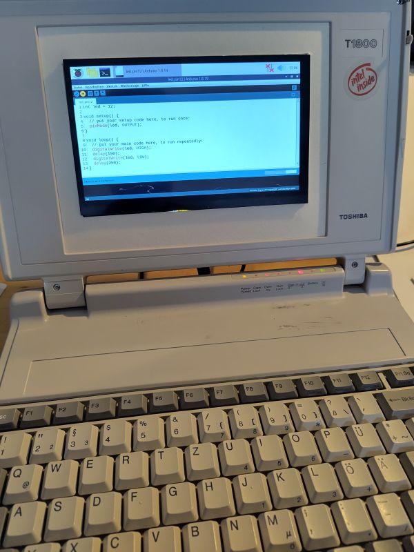 Um das "look and feel" des über 30 Jahre alten Laptops irgendwie zu erhalten, soweit möglich, sollten möglichst viele der Original-Komponenten wiederverwendet werden. Dazu wurde zunächst das gesamte Innenleben des Toshiba T1800 inkl. der Akku-Zellen entfernt und überprüft, welche der Komponenten noch mit einem Raspberry Pi Einplatinencomputer kompatibel waren. Schnell wurde klar, dass außer der Tastatur und dem Taster im Display-Scharnier keine technischen Bauteile mehr genutzt werden konnten, weil sie entweder defekt oder inkompatibel mit moderner PC-Technik waren: