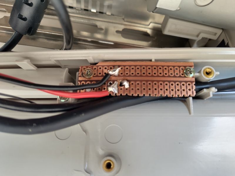 Die Stromversorgung, d.h. der DC-DC-Wandler, wurde in den alten Akku-Gehäuse untergebracht. Dies war umso leichter möglich, als von den Akku-Kontakten an der Unterseite des Laptop-Gehäuses zwei Adernpaare in das Laptop-Unterteil führten, die auf diese Weise - mit Dupont-Buchsen versehen - weitergenutzt werden konnten: Das dickere Andernpaar führt die 12 Volt Eingangsspannung von der Power-Buchse zum Spannungswandler; von dort transportiert das dünnere Adernpaar die 5 Volt Ausgangsspannung über eine Lochrasterplatine mittels umgebauter Micro-USB-Anschlusskabel sowohl zum Display als auch zum Raspberry Pi 1B, um beide Geräte mit Strom zu versorgen:
