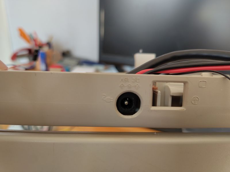 Die Power-Buchse aus dem T1800 konnte aufgrund eines proprietären Formats nicht wiederverwendet werden; stattdessen wurde eine Standard 5,5 mm Hohlbuchse aus einem alten HDD-Festplattengehäuse auf die selbst modellierte Lochrasterplatine gelötet; das 12V 2A Netzteil des Festplattengehäuses diente als Stromversorgung für das Laptop: