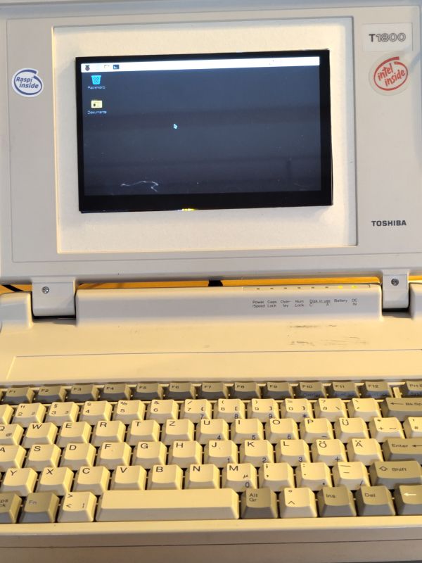 Um das "look and feel" des über 30 Jahre alten Laptops irgendwie zu erhalten, soweit möglich, sollten möglichst viele der Original-Komponenten wiederverwendet werden. Dazu wurde zunächst das gesamte Innenleben des Toshiba T1800 inkl. der Akku-Zellen entfernt und überprüft, welche der Komponenten noch mit einem Raspberry Pi Einplatinencomputer kompatibel waren. Schnell wurde klar, dass außer der Tastatur und dem Taster im Display-Scharnier keine technischen Bauteile mehr genutzt werden konnten, weil sie entweder defekt oder inkompatibel mit moderner PC-Technik waren: